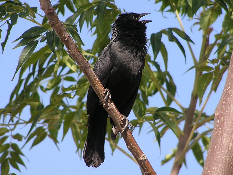 ミゾバシクロムクドリモドキ さえずり中 Gnorimopsar chopi スズメ目アトリ科 英名:Chopi Blackbird 美声の持ち主。しばしば大群で飛来し、大きな害や大きな益をもたらします。 |