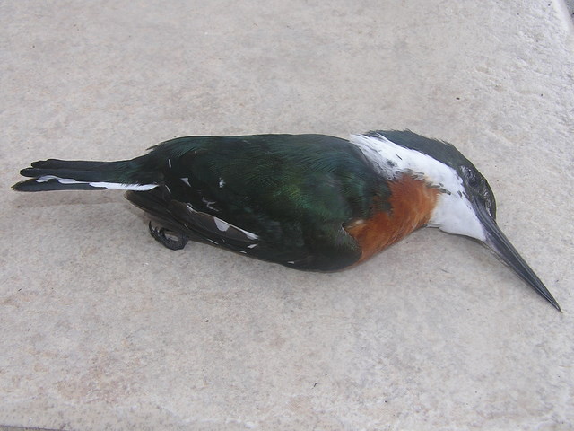 ミドリヤマセミ Chloroceryle americana ブッポウソウ目ヤマセミ科 英名:Green Kingfisher ガラス窓の下で息絶えていました。可哀そうに、ガラス板に激突したのでしょう。 |